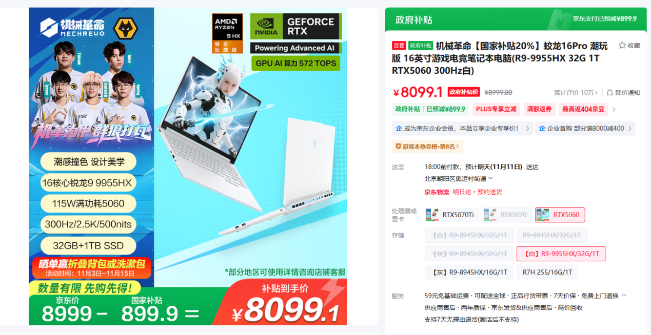 论性价比,万元内的性价比之王非机械革命蛟龙16Pro潮玩版莫属。潮流的撞色设计,航空级铝镁合金材质,同样搭载锐龙9 9955HX处理器,基于创新的Zen 5架构、领先的TSMC 4nm生产工艺,配备16大核心32线程,为整机的强悍性能打下了坚实基础。图形方面,这台机器搭载RTX 5060/RTX 5070Ti笔记本电脑GPU。目前,机械革命蛟龙16Pro潮玩版的补贴价格低至8099元,顶配也不过才万元出头,真的非常有吸引力。