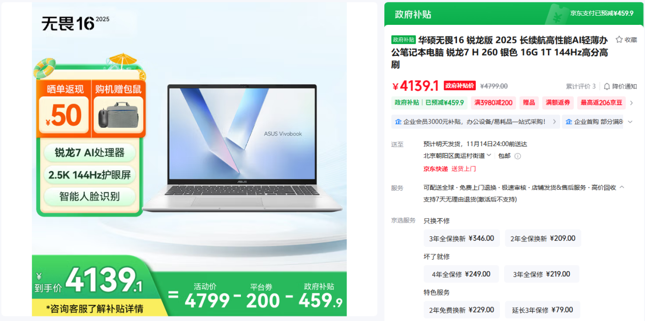 巅峰日电商大促的收官冲刺阶段,叠加国补、政补等多重优惠补贴,此刻入手锐龙笔记本,无疑是“芯更强 价更香”的最佳时机!