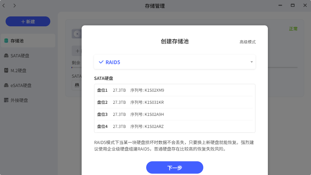 Z425在4个SATA硬盘插满的情况下,支持ZDR、RAID5和RAID6三种存储池创建模式,要想实现最大存储容量,就选择ZDR模式。