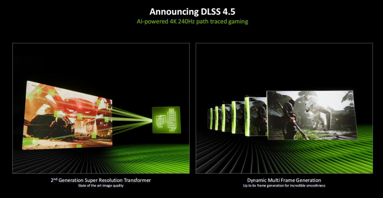 因此,NVIDIA在CES 2026上正式发布了新一代的DLSS 4.5,它最大的两个升级亮点就是支持第二代Transformer模型驱动的超分辨率技术,提供更好的图像质量;支持可动态调整的6×多帧生成功能,提供更高的游戏帧率。得益于这两大特性,就可以实现DLSS 4的升级目标:提供AI驱动的4K/240Hz路径追踪游戏体验。