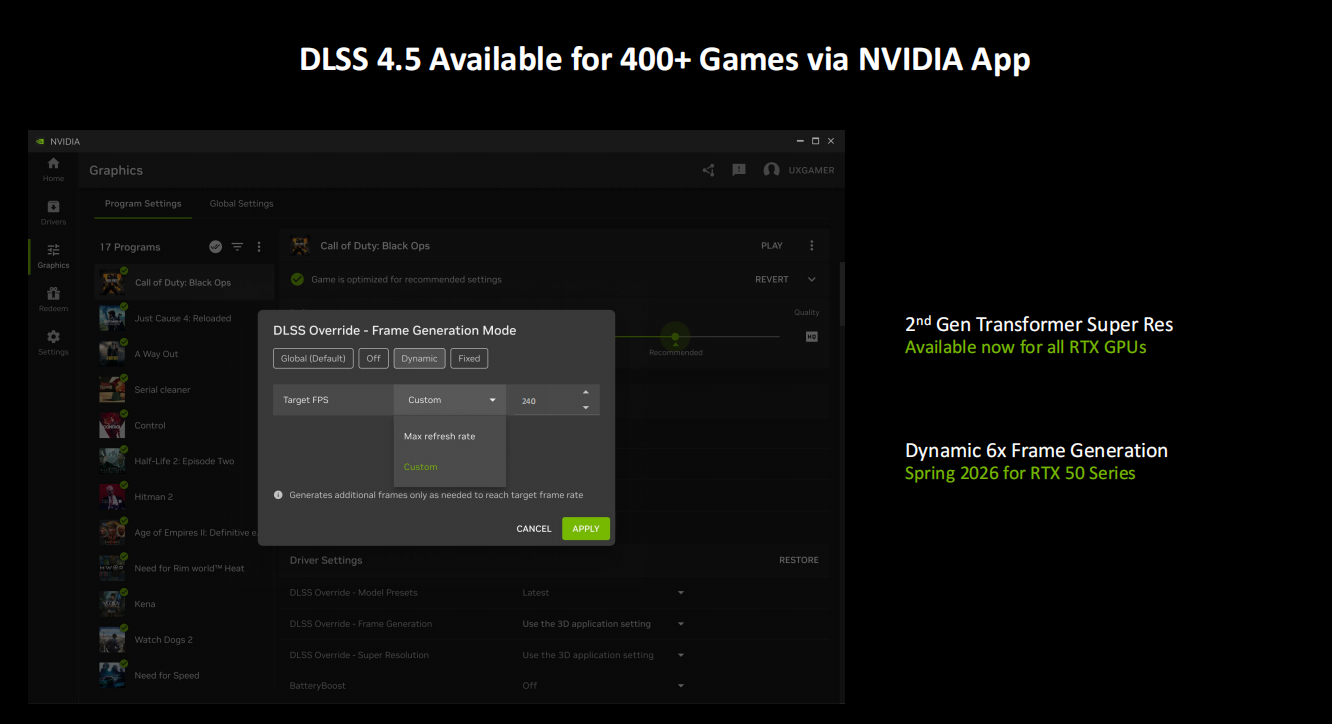 通过NVIDIA APP,玩家就可以在400+的游戏中享受到DLSS 4.5带来的游戏体验提升了。其中第二代Transformer模型加持的超分辨率技术已经上线,而支持动态调节的6×多帧生成功能会在2026年春季上线。