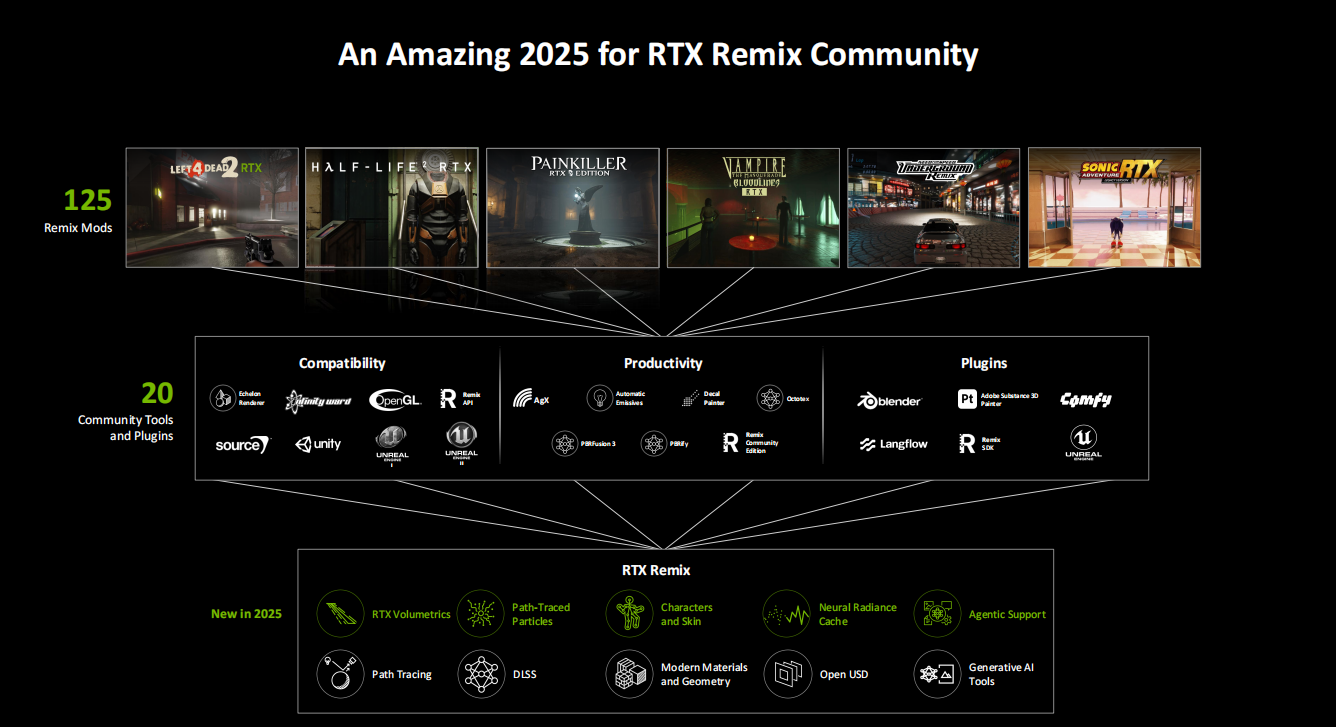 我们知道RTX Remix是NVIDIA推出的一项可以给老游戏添加次世代画面与RTX功能的工具集,可以让老游戏快速推出RTX“重制版”,重新焕发活力。目前已经有125个Remix Mods与20个社区工具与插件。现在NVIDIA推出了RTX Remix的更新。
