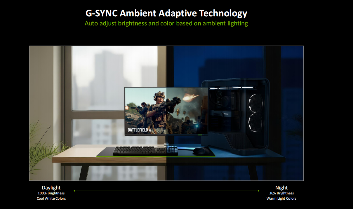 全新的 G-SYNC 智能环境光技术通过内置光线传感器,可智能调节色温和亮度,确保无论是白天还是夜晚,随时都能获得最佳视觉体验。从图中可以看到,在白天,显示器亮度被自动调节为100%,同时使用冷白色调,而在夜晚,亮度被自动调节为36%,并使用暖色调。