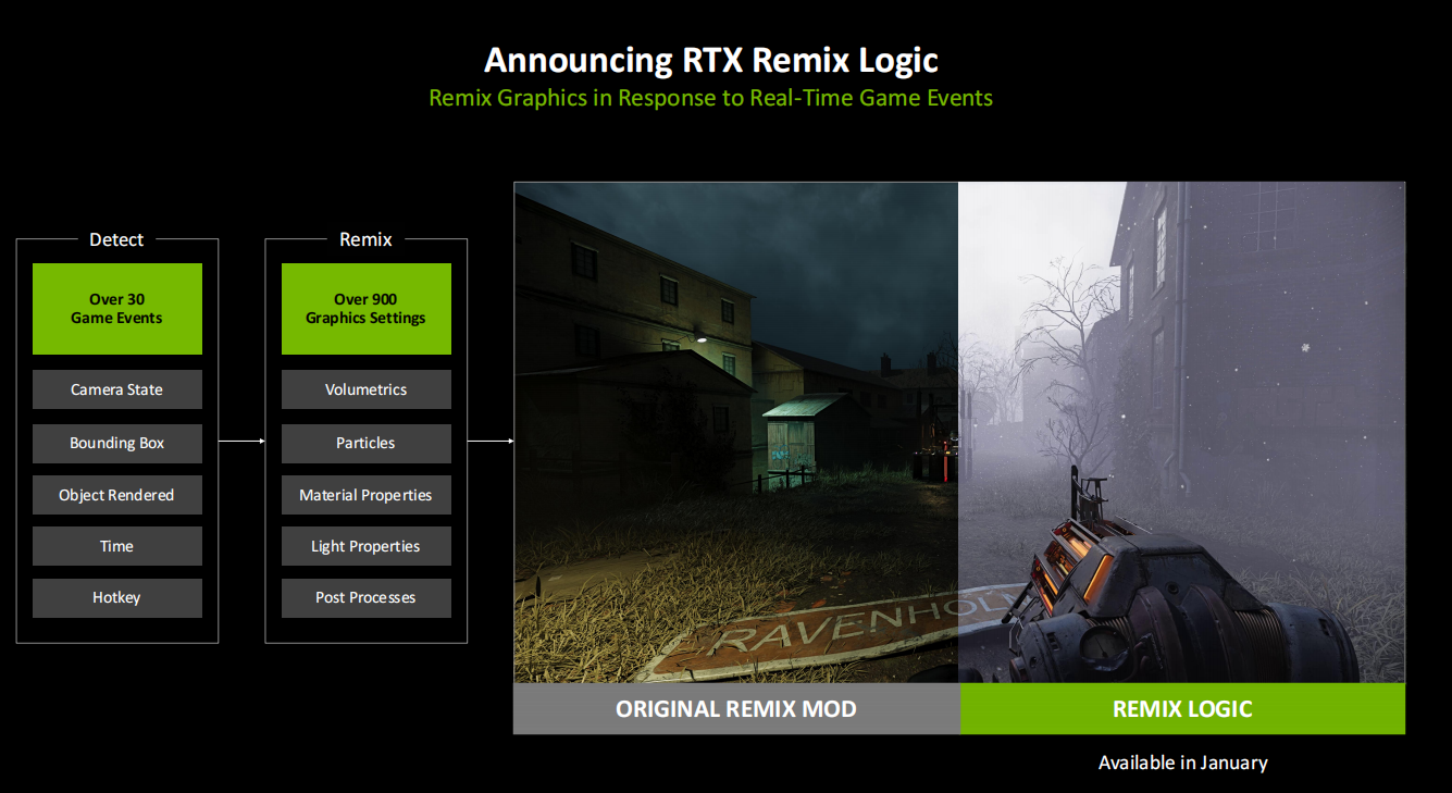新增的RTX Remix Logic可以在游戏中对实时游戏事件做出响应,目前可以对超过30种游戏事件进行响应,响应内容包括对超过900种图形设定。