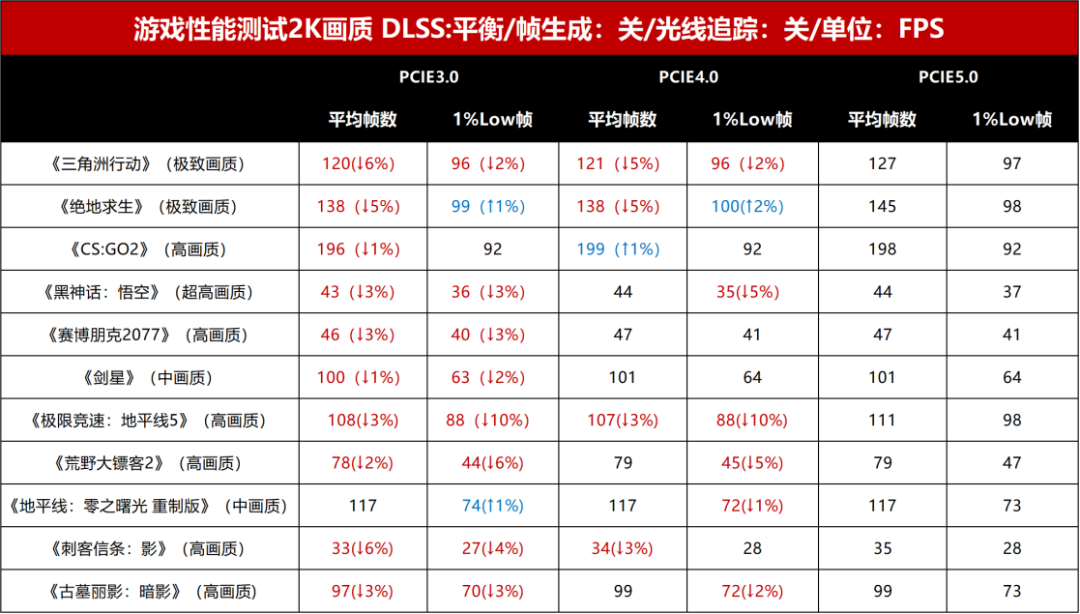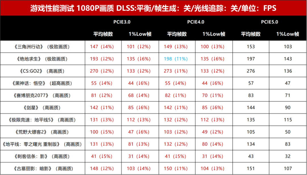 通过测试我们可以看到,以PCIe 5.0的游戏性能为基准,在1080P和2K画质下,大部分的游戏的平均帧数和1% Low帧的差距在6%以内,反映在帧数上的表现只有几帧,在游玩时很难感受到差异。