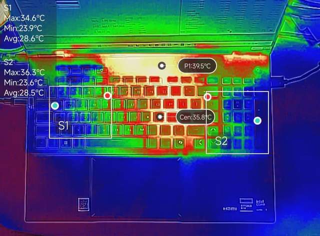C面温度:热量堆积主要在顶部,但也不热,最高40℃左右,按键区域最高在O、P区域,整体凉爽,高负载下不会影响操作体验。