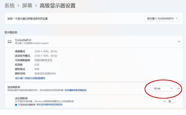 基础优化四:在设置-系统-屏幕-高级显示器设置中,屏幕刷新率设置为60Hz
