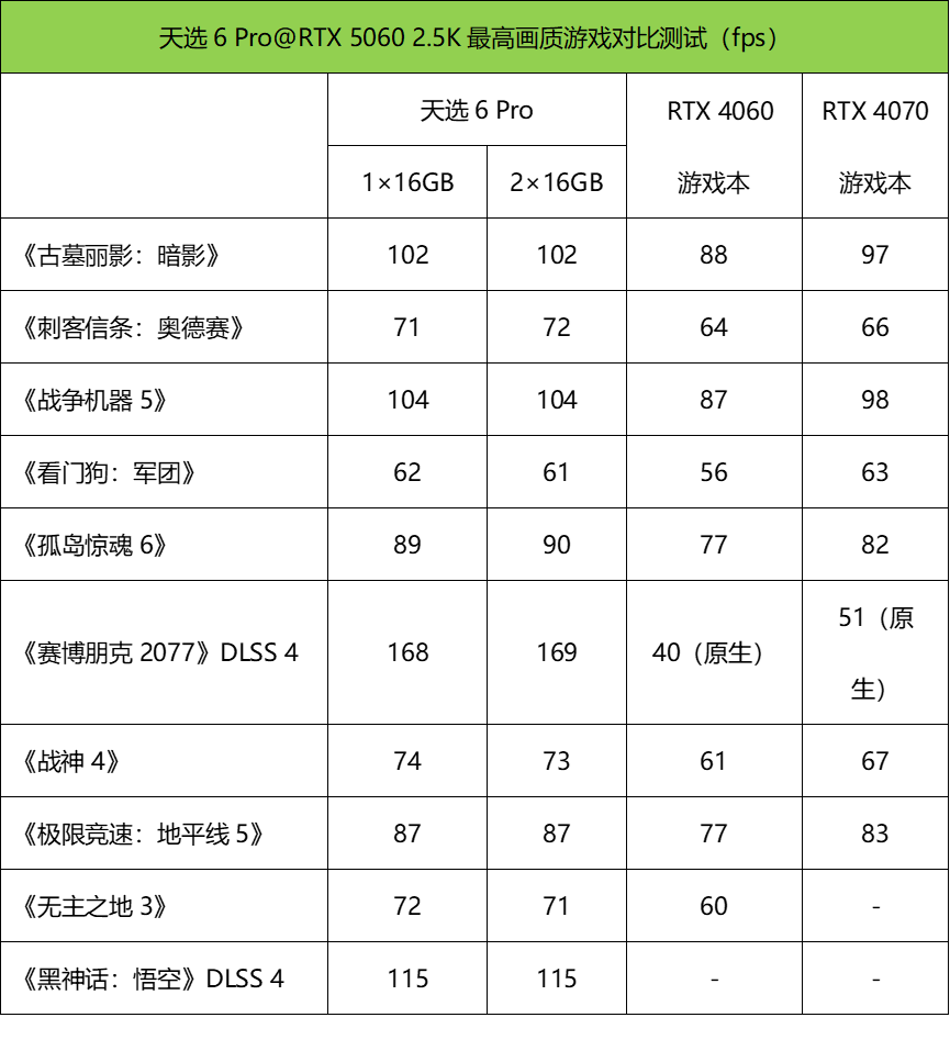 游戏实测如上表所示:《古墓丽影:暗影》102fps、《战争机器5》104fps;《赛博朋克2077》原生53fps,开启DLSS 4质量模式后飙升至168fps,达到电竞级流畅度;即便是显卡杀手《黑神话:悟空》,2.5K影视级画质+ DLSS 4能实现115fps,有DLSS 4加持,基本上可以说能搞定2.5K最高画质3A游戏。
