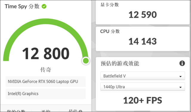 接下来再看看图形性能,天选6 Pro搭载的RTX 5060 Laptop GPU为115W满功率版本,上图是Time Spy场景测试,显卡得分12590(游戏实测采用独显直连+增强模式),标准的满功率RTX 5060成绩。