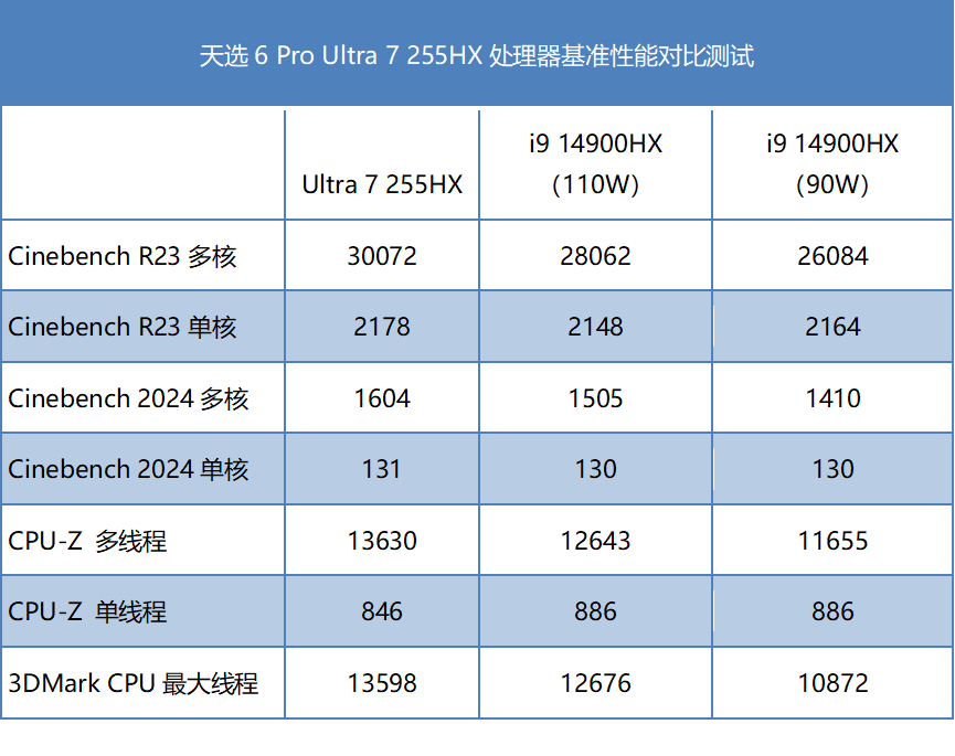 而在基准跑分中,Ultra 7 255HX展现出了强劲的越级实力:Cinebench R23多核跑分达到了30072,超越110W 功耗的i9 14900HX(28062分);CPU-Z多线程13630,同样领先i9 14900HX(12643分);而与同功耗90W的i9 14900HX相比,则轻松实现了全项目碾压。看来,这一代的Ultra 7 255HX能效比出色。