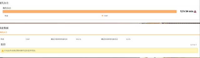 在轻度办公应用中,PCMark10现代办公续航测试是一个用得比较多的测试项目,它的测试结果很直观,关闭WiFi,从99%电量开始测试,到自动关机,续航成绩如下所示,大概是13小时,依然考虑到5%的电池损耗,实际应该能到14小时上下。当然,这也是一个轻度续航测试项目。