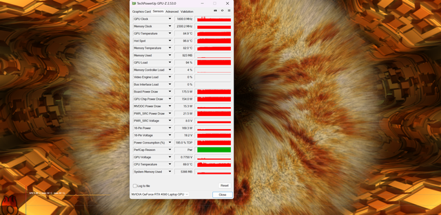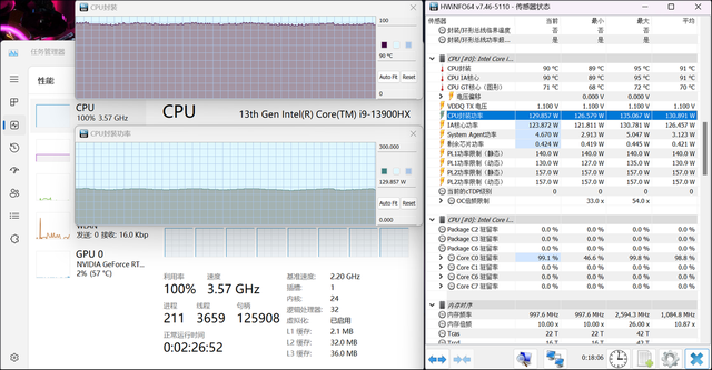 室温24℃左右,依然是极速模式,对掠夺者战斧18进行双考测试(稍微垫高机身),半小时之后的情况如下所示:i9 13900HX处理器的封装功耗约为65W,温度约86℃;RTX 4080的功耗在大概是150W,温度约87℃,整机满载的性能释放达到了215W左右,这个功率输出是相当猛的!