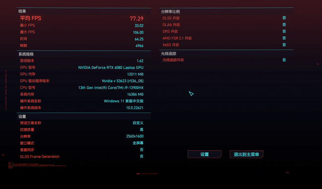▲《赛博朋克2077》,采用游戏自带的基准测试跑分,掠夺者战斧18在2.5K分辨率最高画质平均帧速为77fps,流畅运行。而你看到该游戏在2.5K最高画质下都能跑到超过70帧的平均帧速时,其他游戏就基本没问题了。