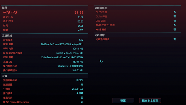 接下来看看光追性能和DLSS 3测试,DLSS 3可以说是RTX 40系独显的核心功能,开启之后能让游戏帧率得到极大的提升。下面的游戏实测中,我们采用两组对比测试,分别是2K最高画质+光追最高+关闭DLSS 3和2K最高画质+光追最高+开启DLSS 3质量。