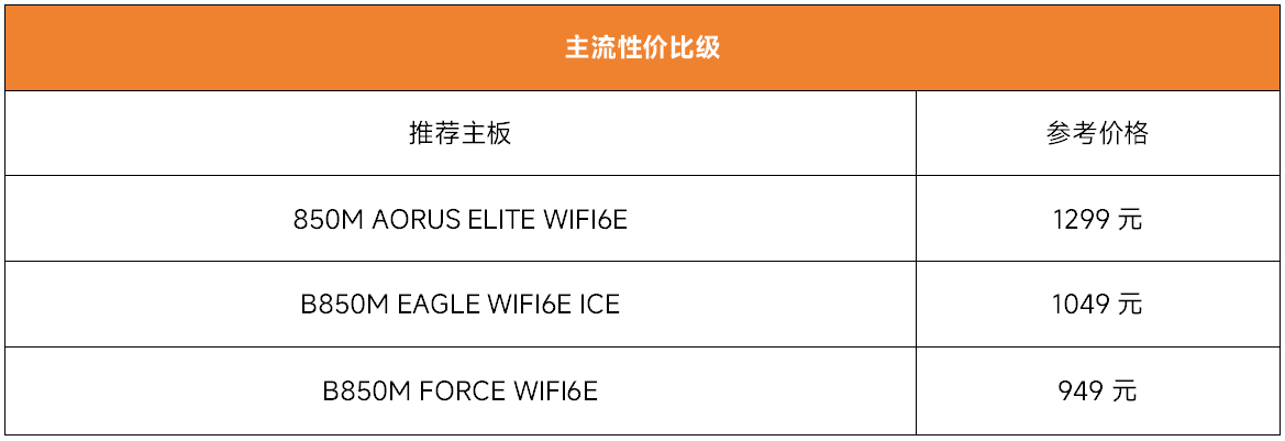 对于追求性价比的玩家,可以考虑技嘉的B850主板。其中850M AORUS ELITE WIFI6E小雕主板采用了12+2+2相供电设计,6层2盎司铜中损耗PCB,配合大面积的Epic VRM散热器,可以轻松发挥旗舰锐龙9000处理器的性能。B850M EAGLE WIFI6E ICE冰猎鹰和B850M FORCE WIFI6E战鹰主板虽然在供电配置上都是8+2+2 相,但性价比相对较高,而且冰猎鹰是目前最便宜的纯白B850主板。战鹰主板价格不到千元,主板本身对高频内存的兼容性也是其一大亮点,在入门级B850主板里属于非常有竞争力的选择。