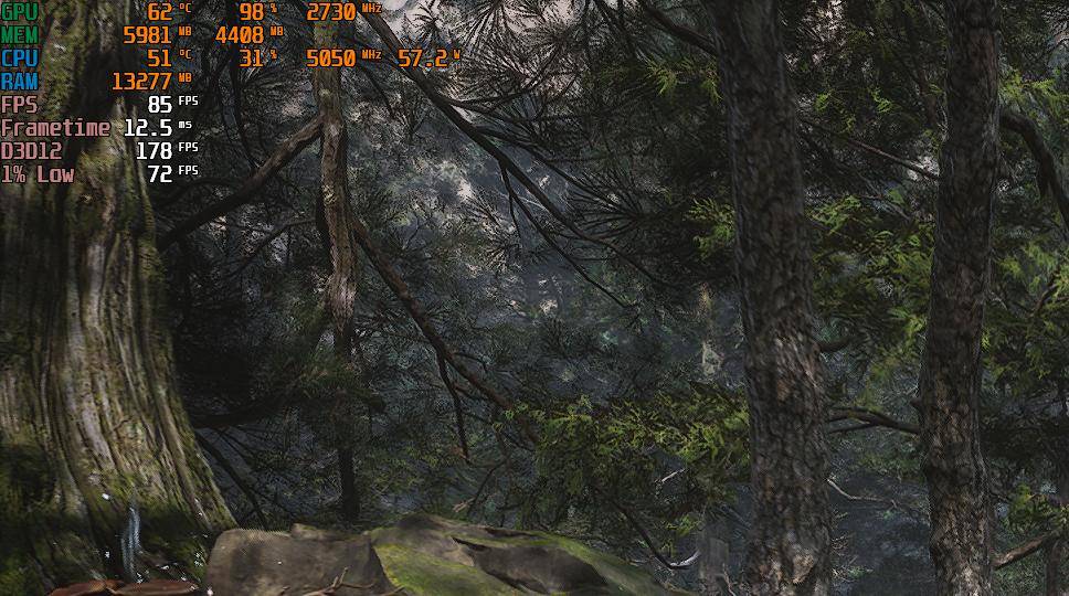 以这套比较经典的中端配置锐龙5 7500F+RTX 5060为例,就足以应对大多数主流游戏在2K+高画质下流畅运行的需求。像《黑神话:悟空》、《赛博朋克2077》这样比较吃配置的3A大作,都能确保70fps以上的平均帧率,画面非常流畅,而且内存占用率不过70%+,表明16GB内存是完全够用的。