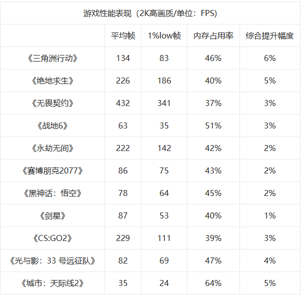 比较值得注意的是《三角洲行动》和《战地6》这两款游戏对内存容量的要求就相对比较高,内存占用率都在80%以上,甚至《三角洲行动》达到了87%,接近90%。而《城市:天际线2》作为知名“CPU压力测试”游戏,对内存容量也有很高的要求,内存占用率达到了100%,也是在我们的意料之中。